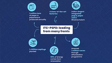 It is often said - from morning to evening - you're likely to interact with an ITC-PSPD product in India - be it in consumer packaging, fast food, pharma, beverages, playing cards, or high-quality notebooks! ITC produces 1 million tons of paper & paperboard annually from 4 state-of-the-art factories, including India's largest integrated pulp & paper mill in Bhadrachalam. A hallmark of environmental stewardship, ITC-PSPD supports a large-scale afforestation programme that has greened 1 million+ acres, with 1.4 billion saplings planted - nearly equivalent to India's population! The initiative has created 240 million-person days of employment. Also, 50% of its energy comes from renewables, making it a sustainable, tech-driven business combating climate change, supporting livelihoods, & reducing import dependency.